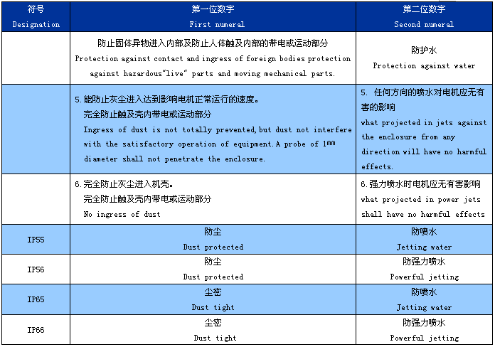 本系列電動(dòng)機(jī)的外殼防護(hù)等級(jí)根據(jù)GB/T4942.1-2001《旋轉(zhuǎn)電機(jī)外殼防護(hù)分級(jí)(IP代碼)》為IP55。如果用戶要求其他防護(hù)等級(jí)可另行協(xié)商。