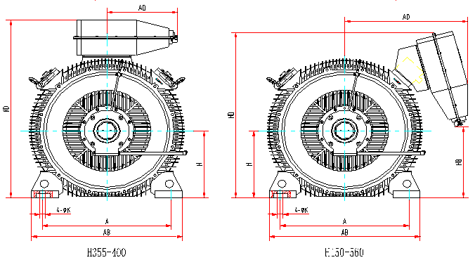 機(jī)座采用平行垂直的散熱筋結(jié)構(gòu),通風(fēng)結(jié)構(gòu)采用兩套獨(dú)立的冷卻風(fēng)格,電機(jī)外部的空氣在外風(fēng)扇的作用下吹過散熱筋,同時(shí)機(jī)座內(nèi)有四條通風(fēng)道,通過內(nèi)風(fēng)扇、轉(zhuǎn)子沖片上的軸向通風(fēng)口形成內(nèi)風(fēng)路,有效的提高了散熱效果。2極電機(jī)外風(fēng)扇采用單向軸流式風(fēng)扇,所以旋轉(zhuǎn)方向不得任意選定,4~8極電機(jī)采用雙向旋轉(zhuǎn)徑向離心式風(fēng)扇,其旋轉(zhuǎn)方向可以任意選定。